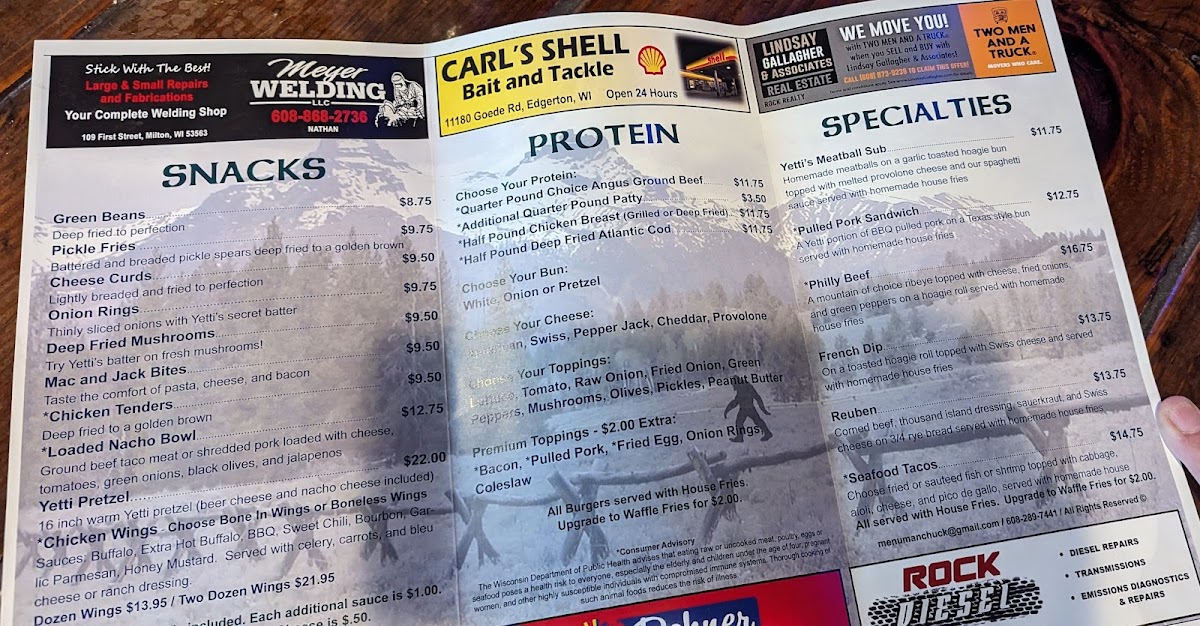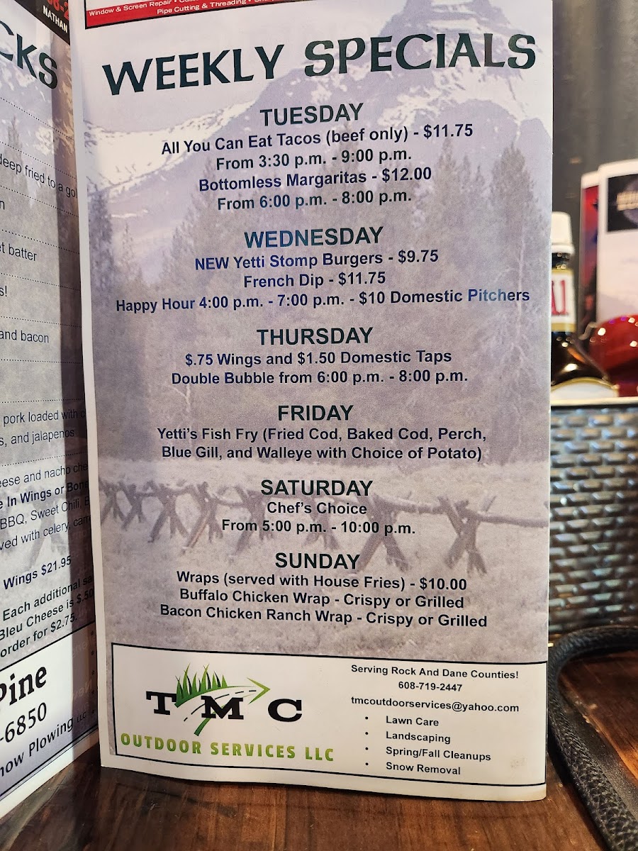 Welcome to Yetti’s Bar & Grill, where a cozy atmosphere meets delightful flavors right in the heart of Edgerton, WI. Located at 11190 N Goede Rd, this gem offers an impressive menu designed to entice your palate. From the standout Yetti's Meatball Sub and hearty French Dip to the classic Reuben, each dish showcases quality ingredients and bold flavors, all priced affordably around $14.75.