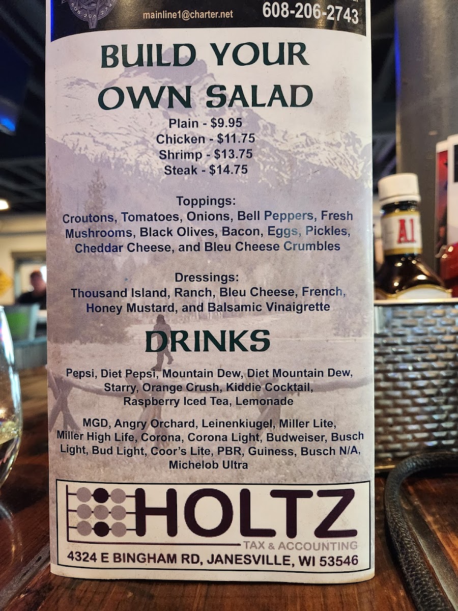 On Sundays, indulge in wraps like the Buffalo Chicken and Bacon Chicken Ranch, available for just $10. Accompany your meal with refreshing beverages including Pepsi, Angry Orchard, and local favorites like Leinenkugel.